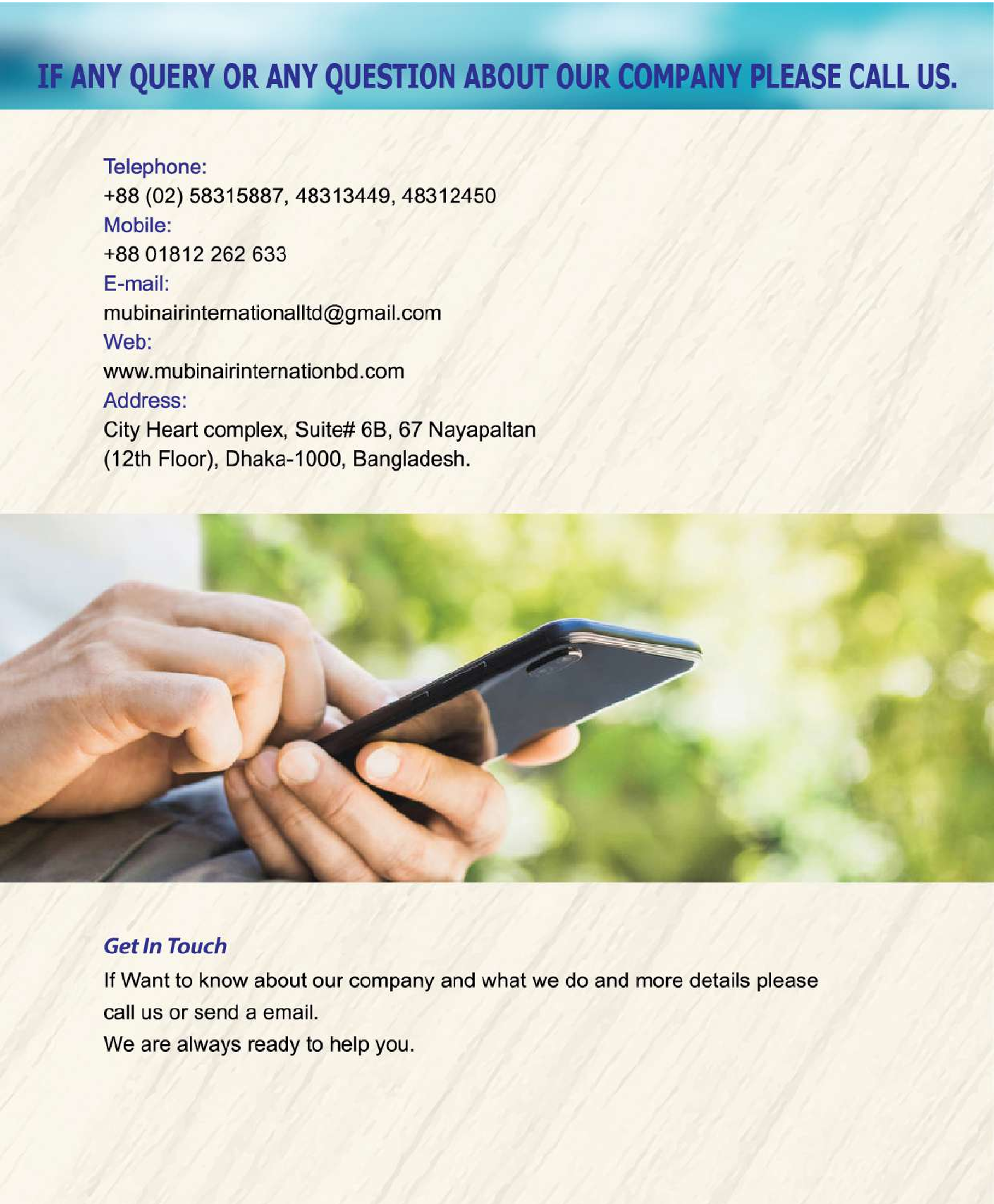 Therefore, we cordially welcome you to the world of Mubin Air International Ltd where your needs of Bangladesh manpower will be.