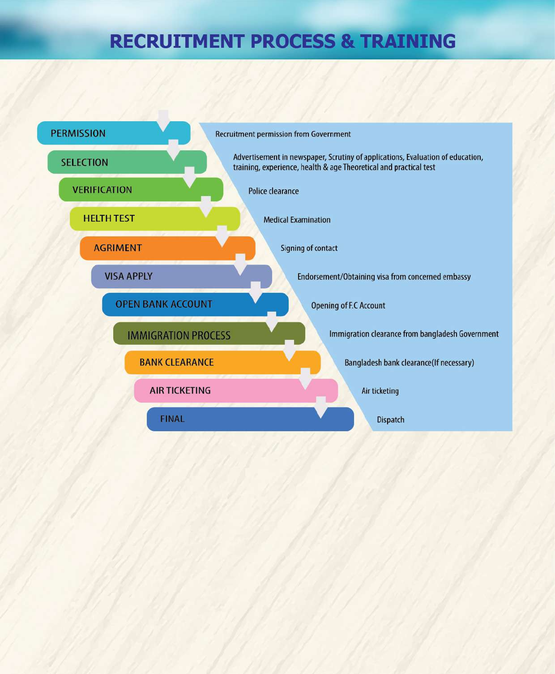 With these aims in view, Mubin Air International Ltd secured a Recruiting Agency License from the Ministry of Labor & Employment, Government of the People’s Republic of Bangladesh. The Company being fully aware of the human factors and social responsibilities including modern requirements of this trade, has organized itself into a well-knit and smooth working team. Mubin Air International Ltd is of vital national significance as Bangladesh’s manpower export trade. Facilities have very carefully been built up and consolidated for mobilization and selection of required number of different categories of workers exactly as per the requirements of the overseas employers.